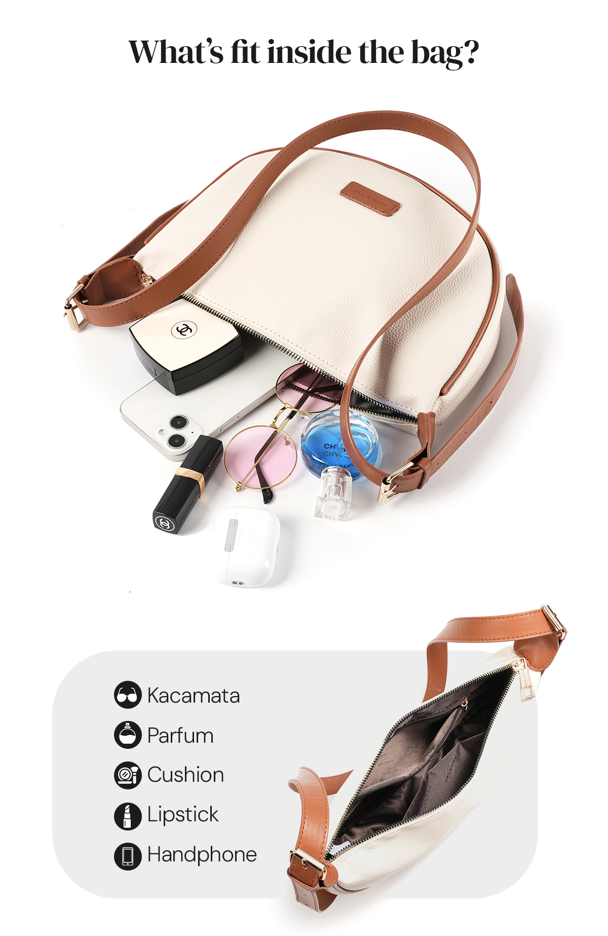 Kompartment Utama yang luas : Dilengkapi dengan Kompartment Utama yang cukup besar untuk menyimpan handphone, parfume, atau barang-barang harian lainnya.