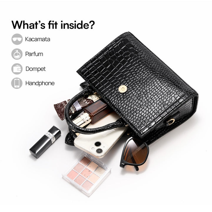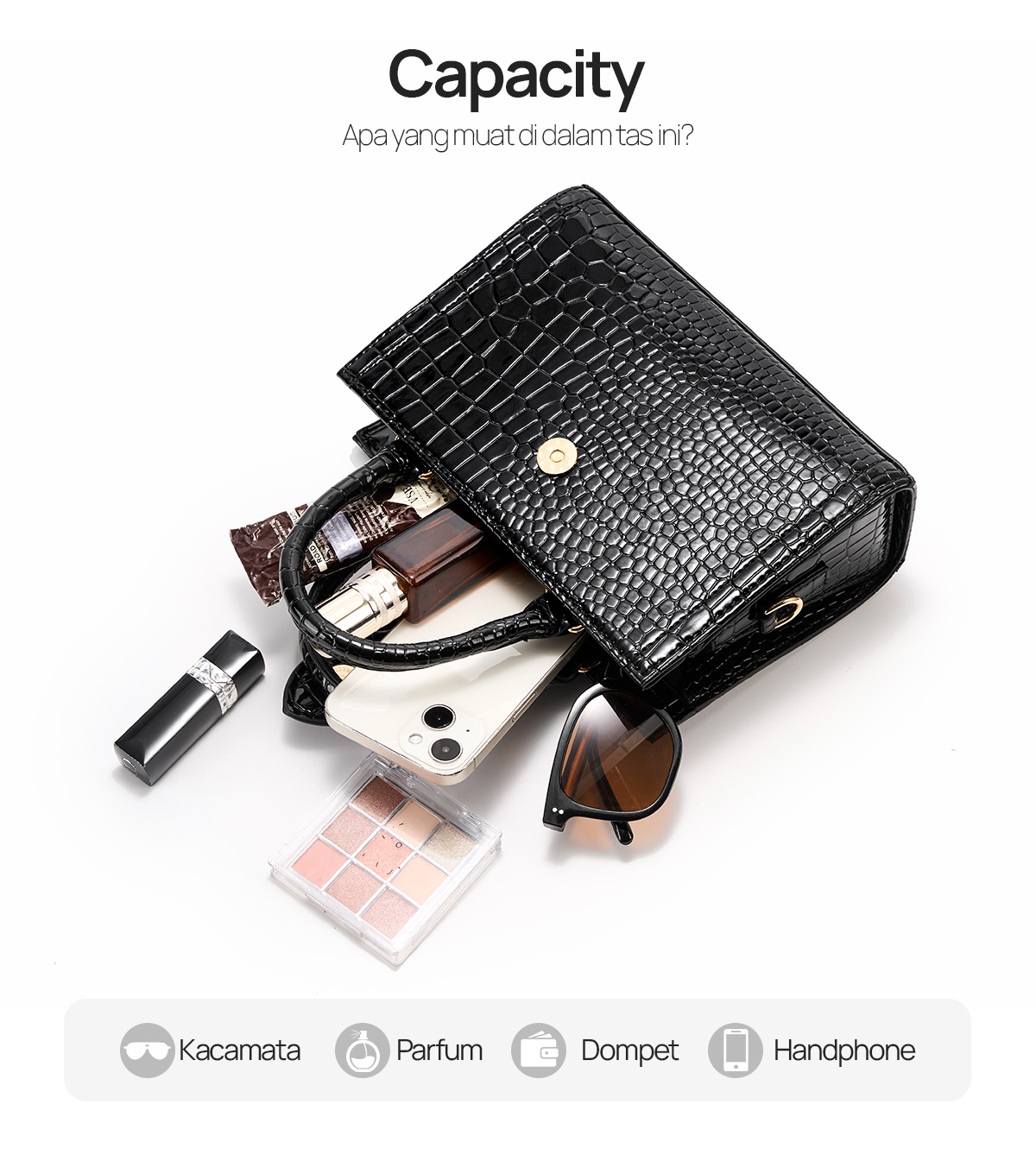 Veyra Sling Bag pilihan tepat untuk Anda yang menginginkan tas berukuran sedang untuk digunakan sebagai tas kantor, atau bepergian. Designnya yang elegant dengan tekstur kulit croco premium, selain memberikan look yang mewah juga sangat awet dan nyaman digunakan. Dengan desain yang luas dan praktis, tas ini menyediakan ruang yang cukup untuk membawa barang-barang penting Anda, seperti dompet, ponsel, parfum, dan kosmetik. Tali selempang yang dapat disesuaikan memberikan fleksibilitas pemakaian, sehingga Anda dapat mengenakannya dengan nyaman sebagai tas selempang atau di tangan sebagai handbag. Dilengkapi dengan resleting berkualitas untuk keamanan tambahan, tas ini memastikan barang-barang Anda tetap aman sepanjang hari.