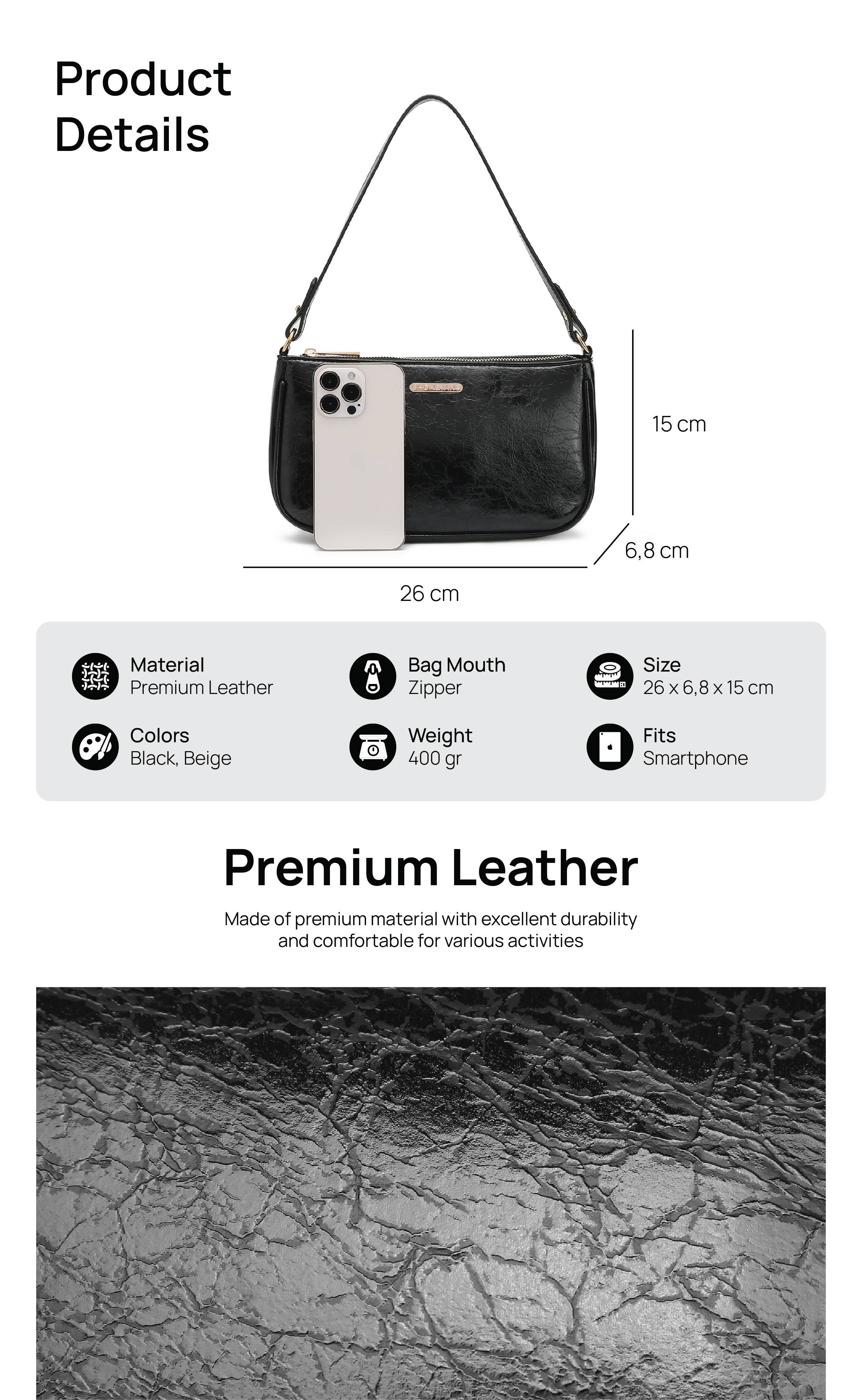 Design Modern : Terbuat dari bahan kulit sintetis berkualitas tinggi, tas ini menampilkan design yang elegan dan simple.