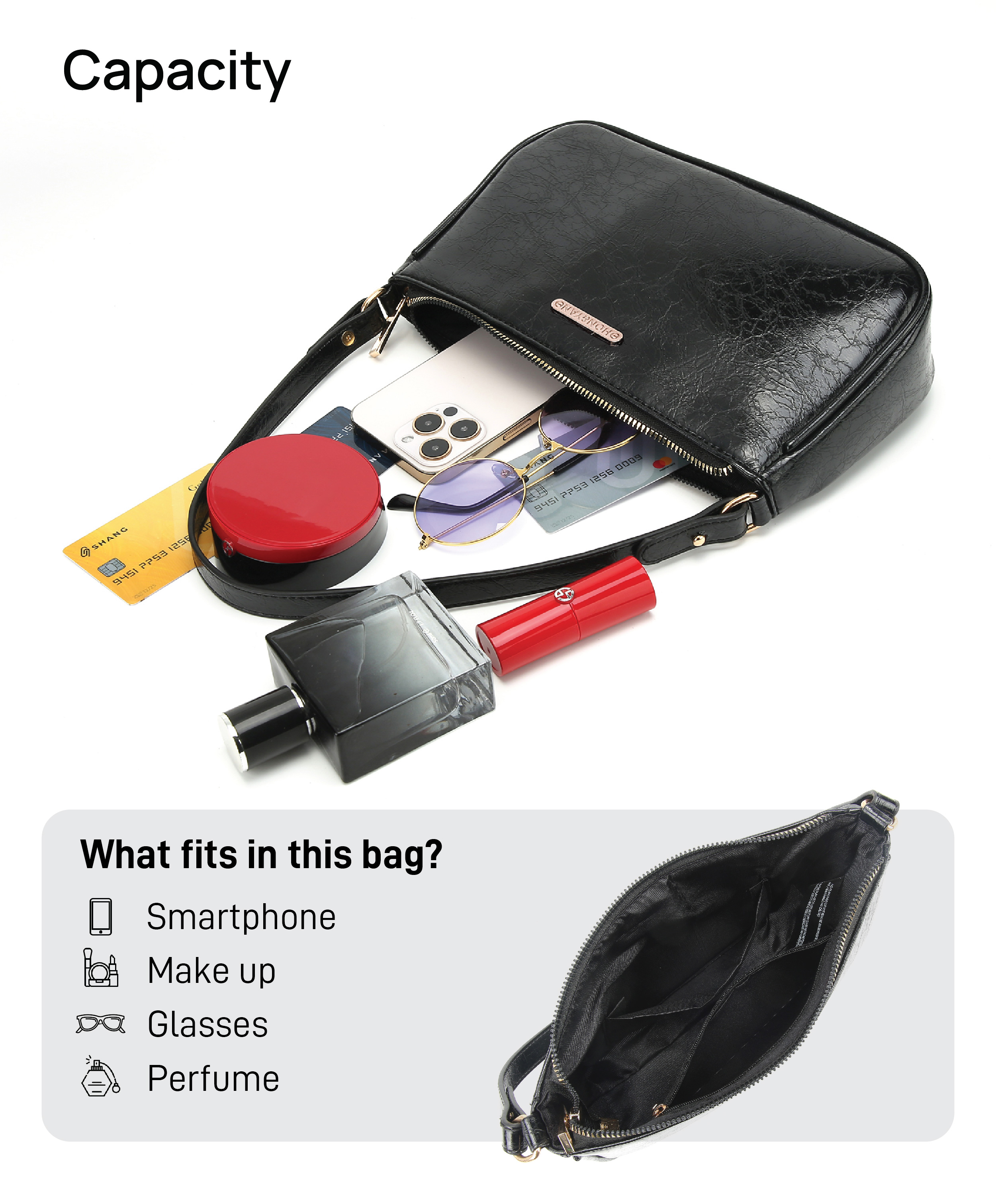 Kompartment Utama yang luas : Dilengkapi dengan Kompartment Utama yang cukup besar untuk menyimpan handphone, parfume, atau barang-barang harian lainnya.