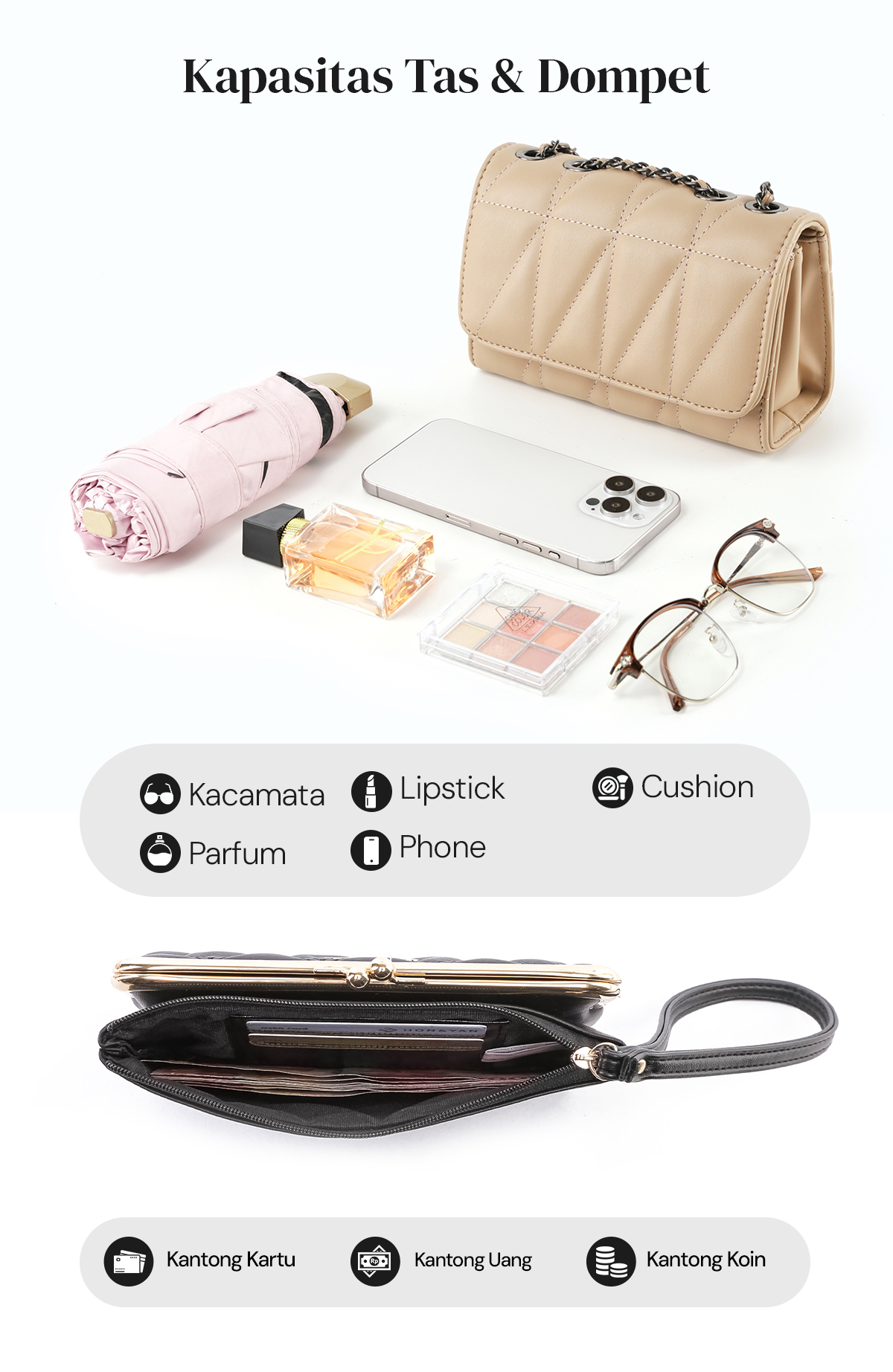 Kompartment Utama yang luas : Dilengkapi dengan 2 Kompartment Utama yang cukup besar untuk menyimpan handphone, parfume, atau barang-barang harian lainnya.