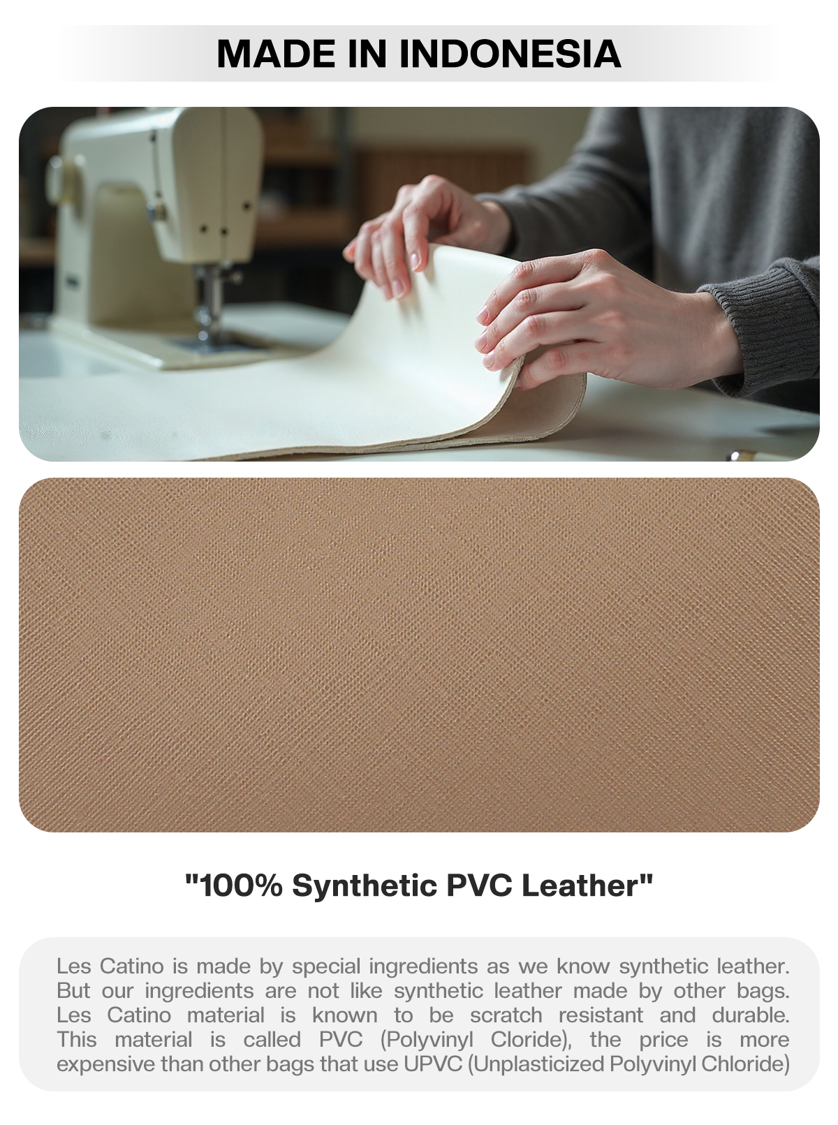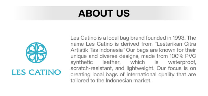 1. Les Catino is made by special ingredients as we know synthetic leather. But our ingredients are not like synthetic leather made by other bags. Les Catino material is known to be scratch resistant and durable. This material is called PVC (Polyvinyl Cloride), the price is more expensive than other bags that use UPVC (Unplasticized Polyvinyl Chloride)